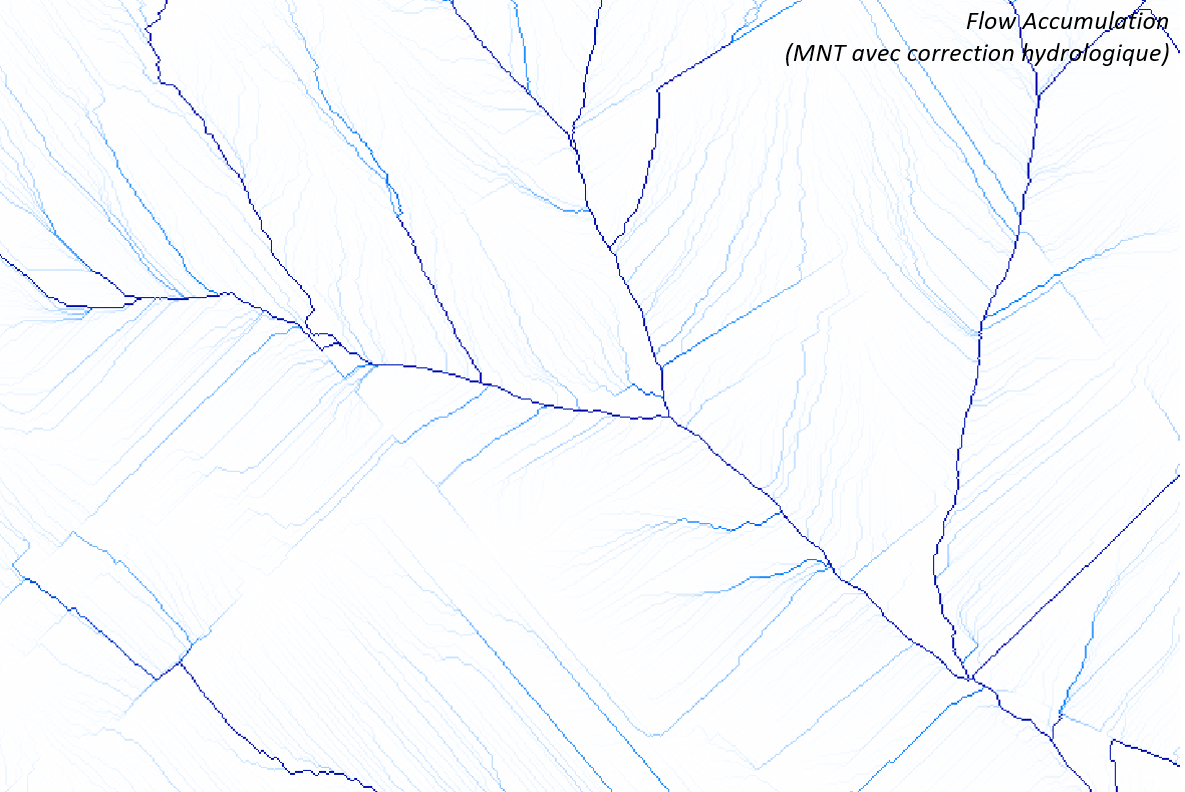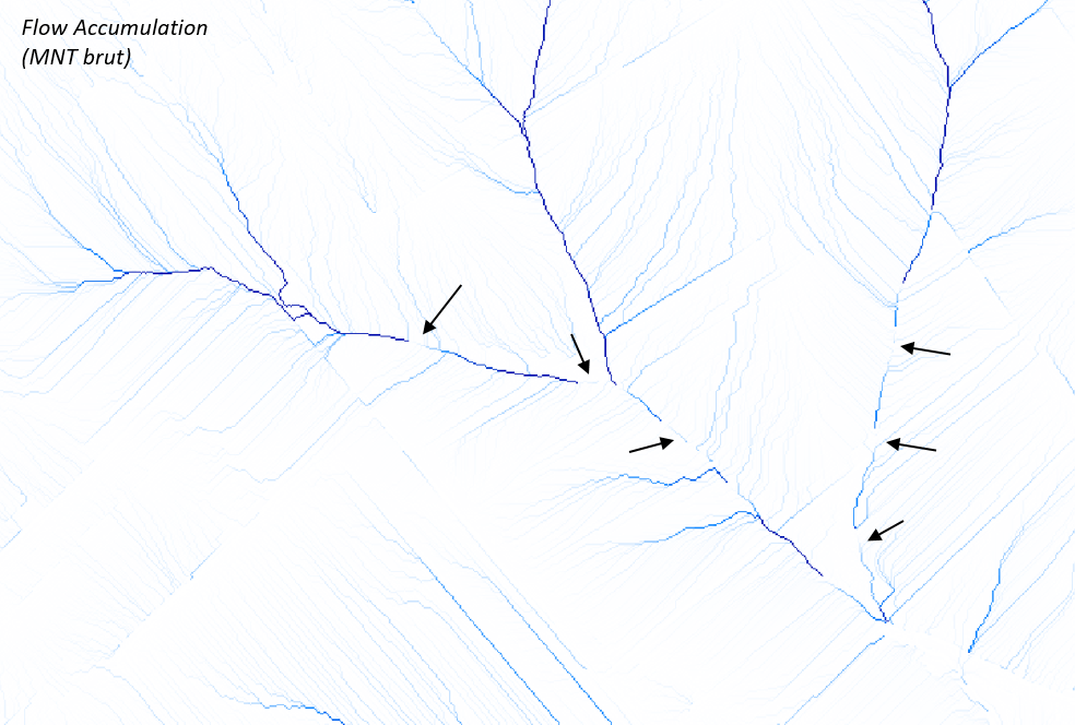 Pour illustrer la nécessité de corriger le MNT brut, l’outil Flow Accumulation est utilisé. Cet outil permet d’accumuler des valeurs depuis l’amont vers l’aval selon le gradient de pente de chaque maille. Les mailles présentant une accumulation de valeurs élevées sont des zones de concentration et peuvent être assimilées à des axes de ruissellement. A l’inverse, les mailles présentant une accumulation de valeur nulle sont des zones locales élevées et peuvent être assimilées à des crêtes.