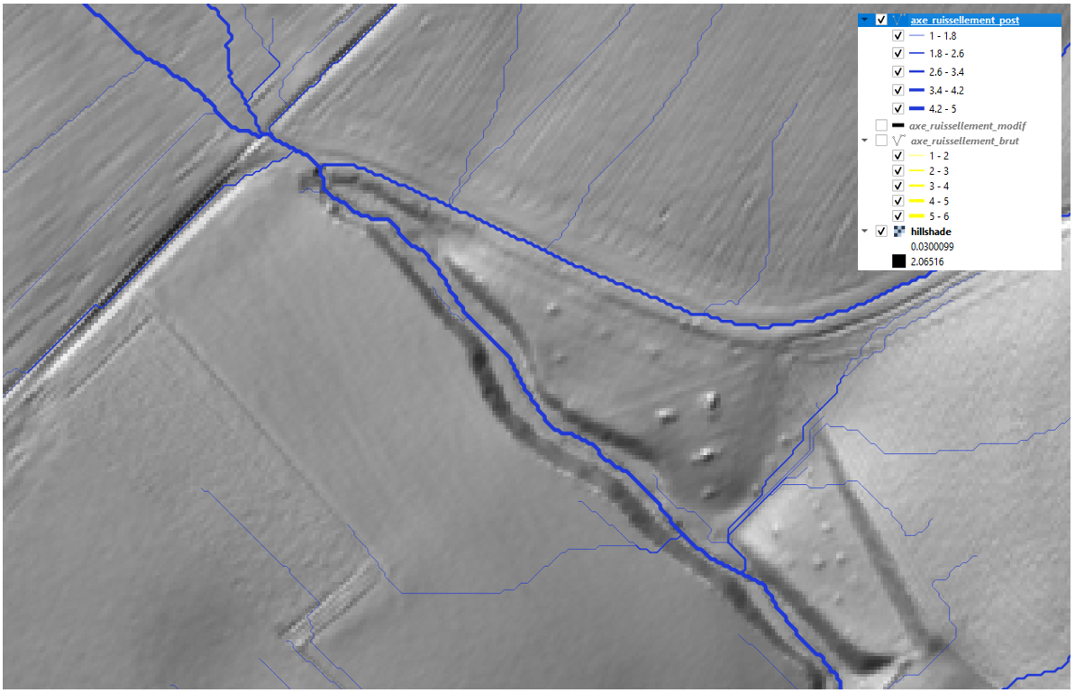 The axe_ruissellement_modif and axe_ruissellement_brut shapefiles are shown below.