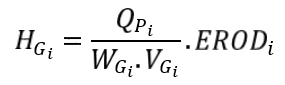 The gully height HGi (or incision height) is deduced from the gully width WGi, the flow velocity VGi and the peak flow QPi. The height is weighted according to the soil erodibility ERODi (the factor varies between 0 and 1, with 0 for non-erodible soil and 1 for highly erodible soil) :