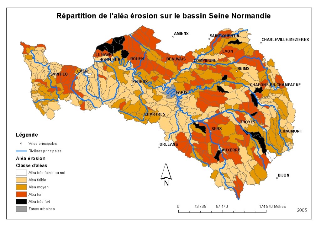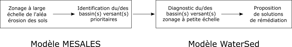 Le modèle MESALES (INRAE) est un modèle expert pour la cartographie de l’aléa érosif (sensibilité du sol à l’arrachement sous l’actions des gouttes de pluie – « effet splash ») (Le Bissonnais et al., 1998, Chabert et al. 2020). Il existe un guide pour l’application à l’échelle départementale (Cerdan et al., 2006 BRGM/RP-55104-FR, « Projet VERSEAU », Landemaine et al., 2022 …). Cette cartographie permet de hiérarchiser les bassins suivant le niveau d’aléa et d’identifier des bassins versants prioritaires sur lesquels des modélisations WaterSed peuvent être réalisées.