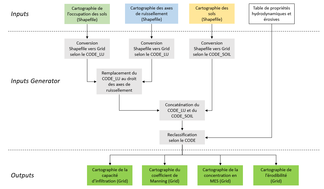L’outil Inputs Generator permet de générer automatiquement les 4 grilles de propriétés à partir des 3 cartographies shapefile d’occupation des sols, d’axe de ruissellement et de sol, et de la table des propriétés hydrodynamiques et érosives. Ces grilles sont générées selon le Grid Sytem du MNT utilisé.