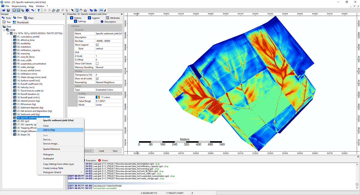 The WaterSed model is running from the SAGA GIS software. SAGA GIS (System for Automated Geoscientific Analyses) is an open source, multi-platform geographic information system (GIS) software released under the GPL licence.