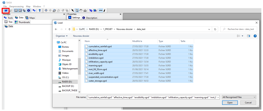 To import the raster grids, click Open and point to the directory. Select the 10 .sgrd files. Click on Open.