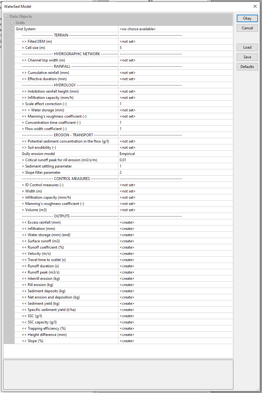 The model interface is organised into menus. The input data is divided into 6 different menus: TERRAIN, HYDROGRAPHIC NETWORK, RAINFALL, HYDROLOGY, EROSION – TRANSPORT and CONTROL MEASURES (optional). The model’s output grids are grouped in the OUTPUTS menu.