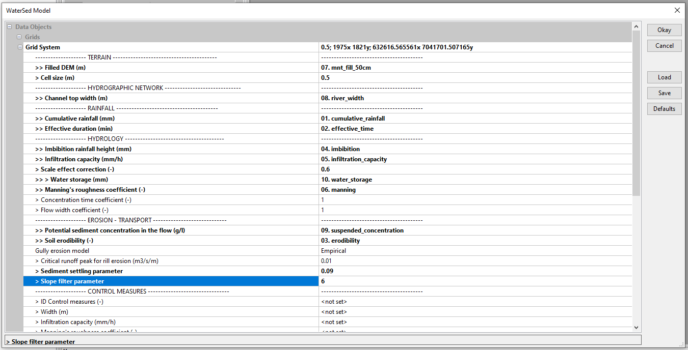 - Slope parameter (-) : parameter used to adjust the effect of slope on sediment deposition