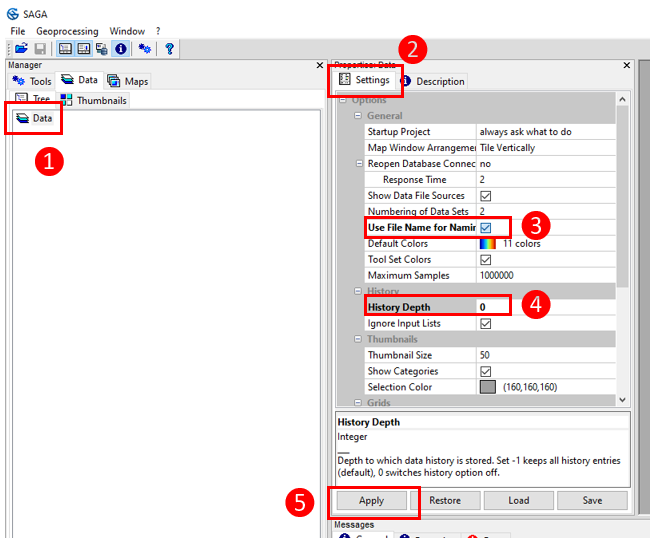 SAGA-GIS needs to be configured the first time it is launched. Click on Data (1), then click on Settings (2) and tick Use file name for naming (3). Replace the -1 value for History Depth with 0 (4). Click on Apply (5).