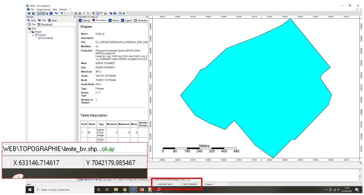 The basin boundary appears in the Data tab. The limite_bv file is automatically filed in Data, Shapes, Polygon. By clicking on limite_bv, the projection system is indicated in the Description tab (in the example, the projection system is Lambert 93). The code EPSG of the projection system Lambert 93 is 2154.
