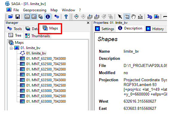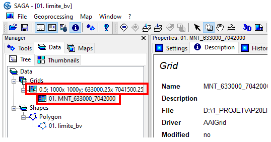 The basin boundary appears in the Data tab and is automatically classified in Data, Grids. In SAGA GIS, each raster tile is classified according to its Grid System. The Grid System describes the tile resolution (0.5), the number of rows and columns (1000x; 1000y) and the X and Y coordinates of the bottom left corner of the tile (633000.25x 7041500.25y).