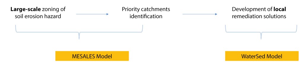 The MESALES model (INRA – now INRAE) is an expert model for mapping erosive hazards (soil sensitivity to detachment under the action of raindrops – « splash effect ») (Le Bissonnais et al., 1998, Chabert et al. 2020). There is a guide for application at departmental level (Cerdan et al., 2006 BRGM/RP-55104-FR). This mapping can be used to rank the catchment according to the hazard level and to identify priority catchment areas, on which WaterSed modelling can be carried out.