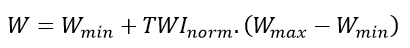The values are then normalized between 0 and 1 and inverted so as to have 1 values at the top of the slope and 0 values at the bottom. These values are finally normalized between two minimum and maximum soil water storage capacity limits :