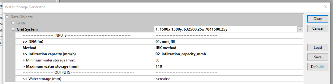 Load mnt_fill.sgrd Grid System. In the DEM menu, point to mnt_fill. In the Infiltration capacity (mm/h) menu, point to infiltration_capacity_mmh. Enter a value of 50 for Minimum water storage (mm) and 110 for Maximum water storage (mm). Click on Okay.