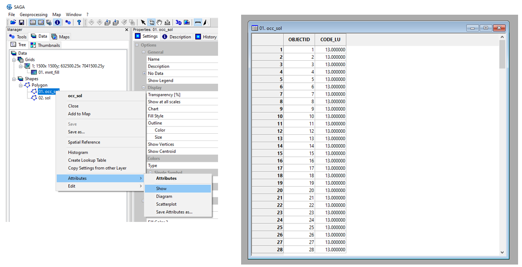 To view the attribute table for the occ_sol.shp layer, right-click on the layer then Attributes then Show. The attribute table contains a CODE_LU field with a code ranging from 1 to 20. The land use class associated with each code can be seen in the nomenclature_occsol.txt file.