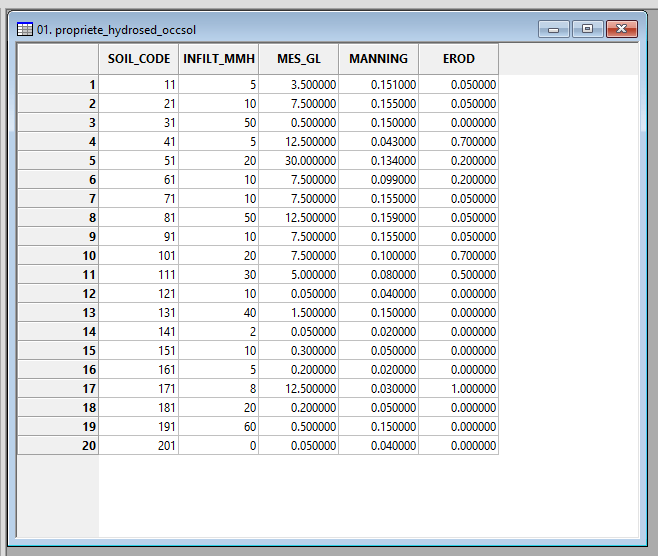 Each CODE is characterized by an infiltration capacity (INFILT_MMH), a SPM concentration in runoff (MES_GL), a Manning’s ratio (MANNING) and an erodibility (EROD).